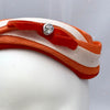 We just love beautiful architecture in a vintage hat! Daphne is straight out of the 1950s but with a fun twist to her pillbox shape. She's made of stiff orange linen, with a slightly rounded crown and 3/4" ivory linen banding wound through in a most delightful way. She also features a sweet orange velvet bow with a rhinestone accent. Daphne frames the face in a most appealing way, her delicate folds lined with orange velvet. So much more to this cocktail hat than originally meets the eye! 22" internal circumference.
