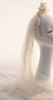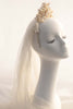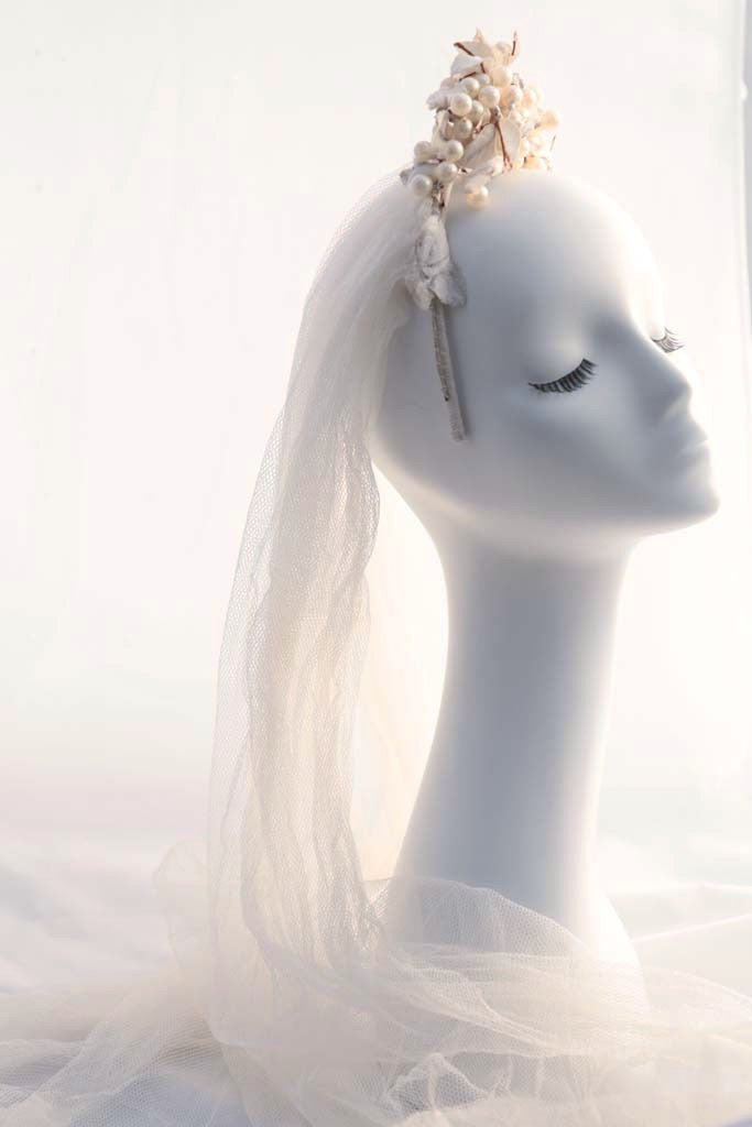 Calling all vintage brides: your bridal veil has arrived! Perlei is an exquisite vintage ivory tulle bridal veil with an antique headpiece comprised of faux pearls and millinery leaves. Both pieces are attached to the original headband. While there are some age related dark markings on the headpiece, we think it simply adds the elegant patina of tradition and heritage. You'll take a step back in time with this glorious heirloom!